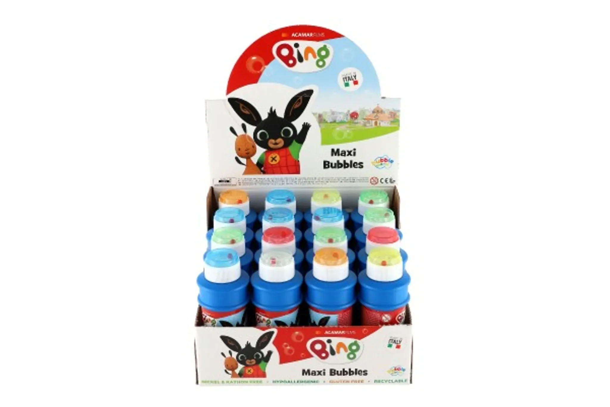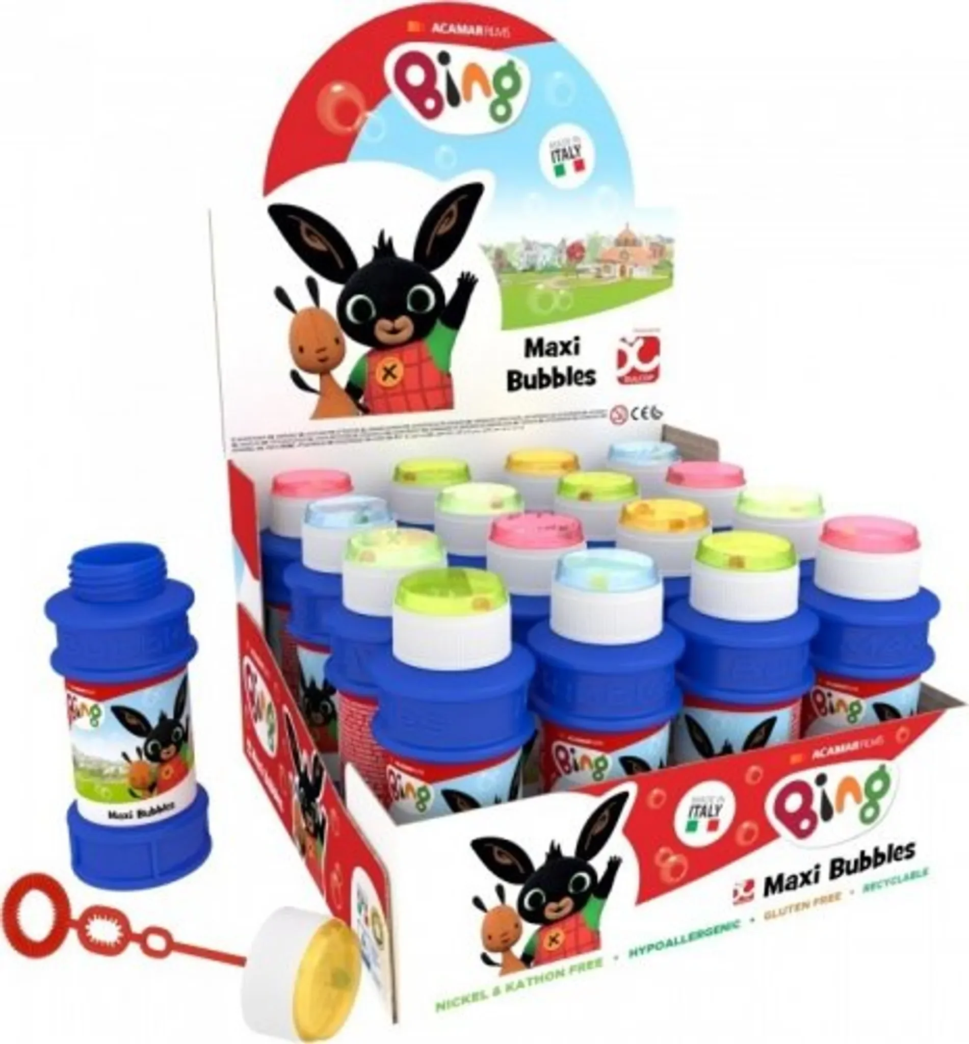 Der farbenfrohe Deckel ist nicht nur dekorativ, sondern enthält auch ein integriertes Blaswerkzeug sowie ein kleines Spiel. Dank der beliebten Bing-Lizenz begeistert dieser Seifenblasenmacher besonders kleine Fans der Serie.